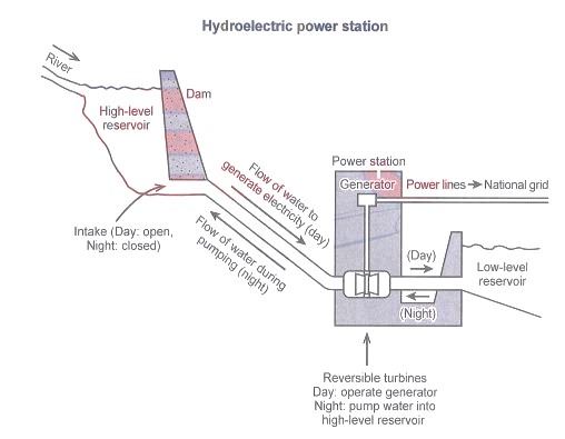The water for this procedure is obtained through a river, and a high risen reservoir is created in order to store it. A dam is built next to the reservoir, through which the liquid is flown out during the day for electricity production, while it is pumped back during the night, to be stored. For the intake, the reservoir is open in the daytime, while closed during late hours.