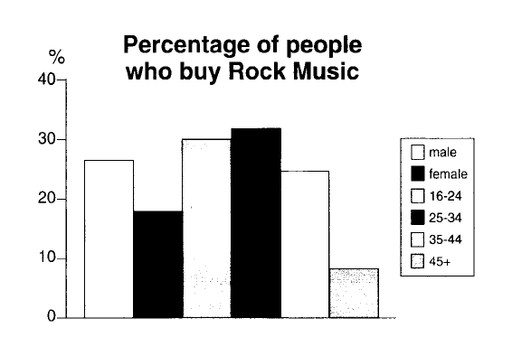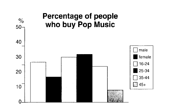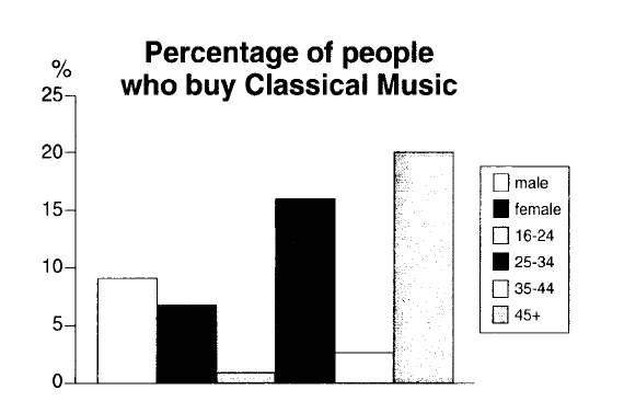 A glance at the graph reveals that Albums purchased by men made up 26, 9 and 28 percent for Rock, Classical and Pop music respectively. Secondly, there are significant variations in the sales of the music albums for the different age groups. Interestingly, the purchasing habits of all the four age groups have an almost identical pattern for Rock and Pop music albums, with sales for the former group accounting for 30, 31, 26 and 8 percent for the 16-24, 25-34, 35-44, and 45+ groups respectively. Album sales were quite different; obviously the older age group for 16%. Surprisingly, the 35-44 years age group was minimally interested in Classical music with a share of 3% only. Finally, as expected, the youngest age group was completely uninterested in Classical music with only 1% sales share.